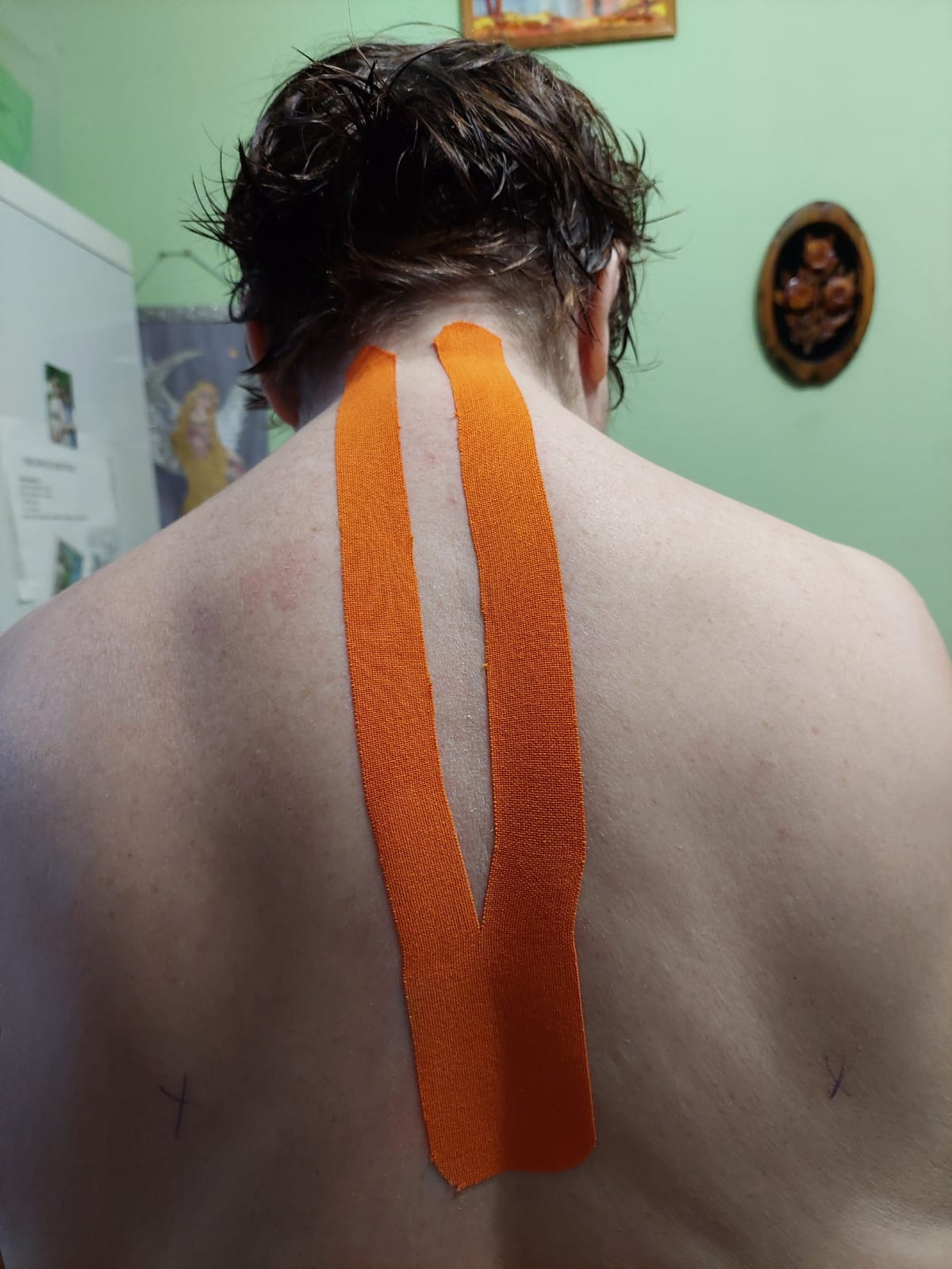 Тейпирование для поддержки шейно-грудного отдела позвоночника, снятия гипертонуса с верхней части трепецевидных мышц